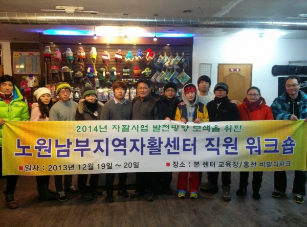 노원남부지역자활센터는 지난 12월 19~20일 '2014년 사업계획을 위한 워크숍'을 진행했습니다. 19일은 2014년 사업계획을 위한 논의를 위해 오전에는 자활근로(DP종합관리, 우리시설관리센터, 더불어홈닥터스, 나눔헬퍼, 더불어해피클럽, 정성배달, 행복충전, 아름다운세상) 사업단을 논의 했고, 오후에는 자활센터, 자활기업(토탈클리닉, 환경클리닉, 한마음클리닉, 원클리닉,행복클리닉, 토탈소독방역클리닉, 나눔클리닉, 정성클리닉, 참클리닉, 마음모아클리닉, 토탈돌봄, 행복나눔, 정성배달), 바우처 사업(노인돌봄, 가사간병, 장애인활동지원사업)을 논의했습니다. 다음 날인 20일은 강원도 홍천에 있는 비발디파크에 동절기 레포츠를 통한 공동체 훈련을 실시하여 자활센터 실무자들의 공동체의식을 고취시켰습니다.