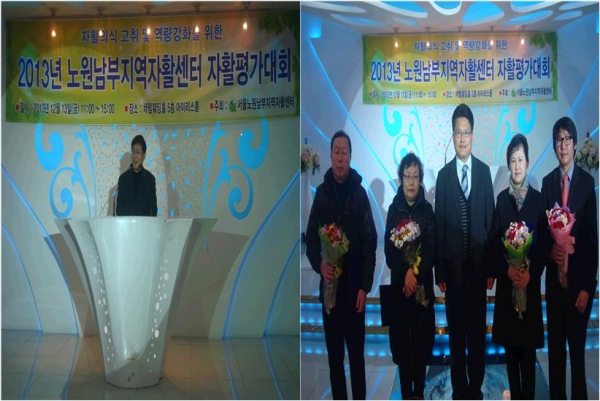 노원남부지역자활센터(관장 정길수)는 지난 12월 13일 자활의식 고취를 위한 「2013년 노원남부지역자활센터 자활평가대회」를 개최하였습니다. 이날 자활평가대회는 1,2부로 나누어 1부에서는 자활근로 참여자 시상(구청장상, 기관장상) 및 기관소개 활동영상 상영, 자활수기 발표, 축하공연(홍금숙 참여자, 센터직원)을, 2부에서는 만찬회와 레크리에이션이 진행 되었습니다.
